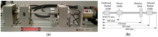 The proposed fault recovery scheme is demonstrated on the experimental AMB test rig shown in Figure 2. The test rig, manufactured by SKF Magnetic Bearings (Calgary, AB, Canada), consists of a rotor supported on two radial AMBs and one thrust AMB. The rotor is driven by a DC electric motor via a flexible coupling. There is one disk between the bearings and each AMB has a target rotor. The target rotors are of material and appropriately sized optimize the magnetic force from the AMB stator coils. The TD bearings are rolling element type and are situated on the shaft directly outside of each radial AMB target rotor. The TD bearing radial clearance is 190 µm. The shaft is steel and has a diameter of 16 mm.