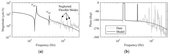 Bode plot of open-loop plant system identification data and model at a characteristic radial input-output pair on the inboard AMB. (a) Magnitude; (b) Phase.