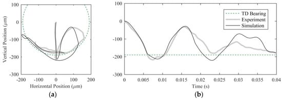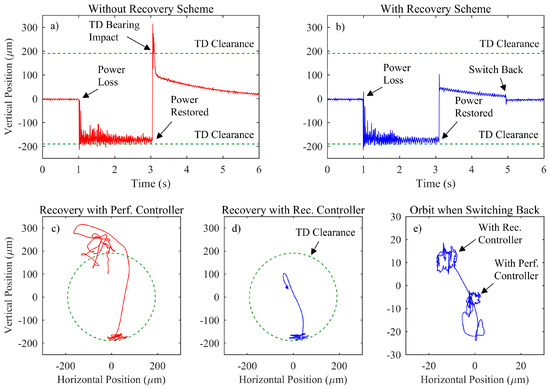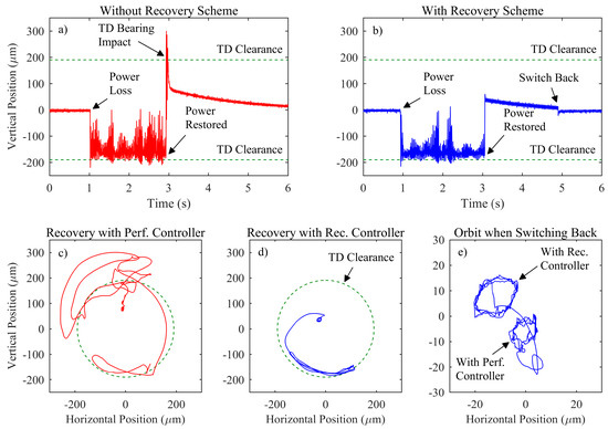 Plots of Figure 7c,d show the orbits during relevitation with the performance controller and the recovery controller, respectively. The TD bearing radial clearance is indicated with the dashed line. The orbit plot including horizontal and vertical response better shows the violent overshoot when attempting relevitation with the performance controller and the possibility of developing into a contact mode. Plot of Figure 7e shows the orbit of the recovery scheme trial when switching from the recovery controller back to the performance controller. Smaller orbit size and less overall deflection from the AMB center indicates superior performance of the performance controller when inside the proper operating region.