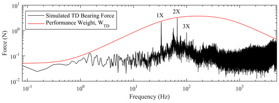 Frequency spectrum of the simulated TD bearing force on the rotor during rolling/bouncing at 2000 RPM and corresponding performance weighting function. The largest force magnitude at each radial axis is taken at each frequency.
