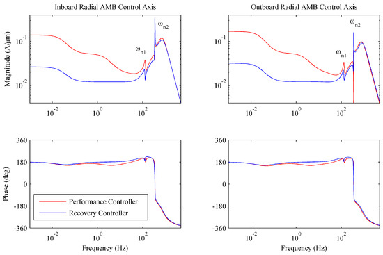Bode plots of the AMB controllers designed for performance under normal operating conditions and for robust levitation recovery. Left plot is for the input-output on the inboard AMB and the right plot is for the pair on the outboard AMB in the same plane.