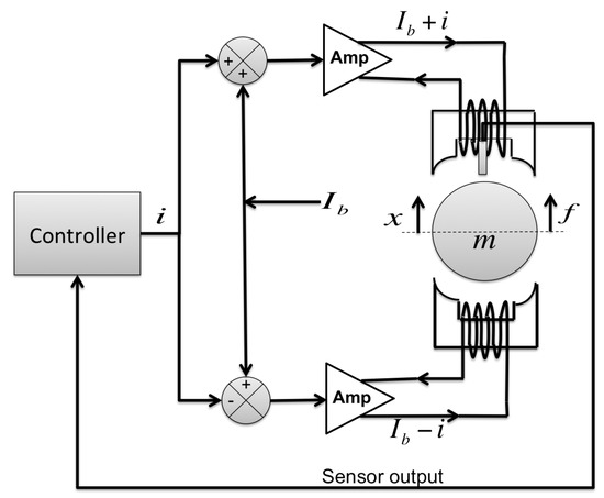 The use of magnetic forces to overcome the forces exerted on a moving mechanical body is the fundamental idea behind how magnetic bearings work. There are several benefits of magnetic bearings over conventional bearings, such as low losses due to non-contact operation and active control capability which can enhance the stability of the system. Furthermore, as a result of low mechanical wear and losses, system maintenance costs are significantly lower. Commercial applications that employ magnetic bearings include compressors, centrifuges, high-speed turbines, energy-storage flywheels, and high-precision machine tools. Magnetic bearings can be either passive or active. Passive Magnetic Bearings use repulsive forces from the interaction of similar poles of two permanent magnets to keep the rotor away from the bearing surfaces. Active Magnetic Bearings (AMB) use actively controlled electromagnetic forces to control the motion of a rotor or another ferromagnetic body in the air. An AMB system normally consists of sensors, electromagnets, power amplifiers, power supplies, and controllers [1]. Figure 1 shows the basic principle of an AMB system in one degree of freedom.