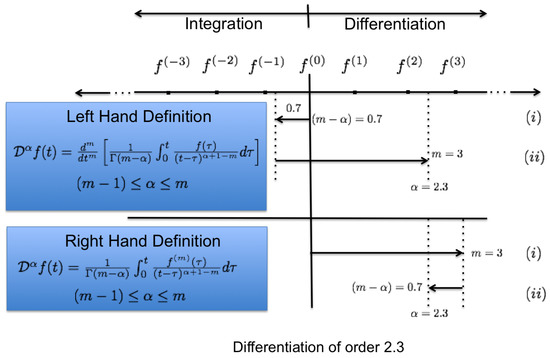 Again, the reason that Caputo definition is also called RHD can be visualized from Figure 3. Here, we will focus on Caputo’s definition, which many engineering applications refer to, since it allows the formulation of initial conditions in a form involving only the values of integer order derivatives such as and .