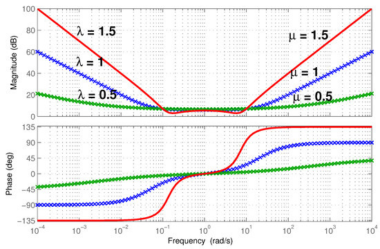 Similar to a conventional PID controller, the FOPID controller behaves as a bandstop filter that passes most frequencies unaltered, but attenuates those in a specific range to very low levels. Generally, the integral part in the conventional PID control helps to eliminate the steady state error due to its infinite gain at zero frequency but it has 90° phase lag. On the other hand, the derivative part provides 90° phase lead, but has a large gain at high frequencies, which is susceptible to noise. By changing the derivative and the integral order in an FOPID controller, one can adjust the sharpness of the filter independently as illustrated in Figure 5. In the frequency domain, the magnitude curve of the fractional derivative and integral terms in the logarithmic scale can be calculated as