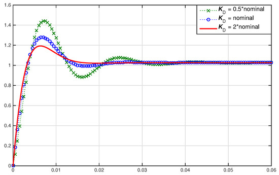 This system has two poles at 64.45 and −62.03, indicating that the system is open loop unstable. Therefore, a Proportional-Derivative (PD) controller is adopted to stabilize the system. For the purposes of stability, the values of and are chosen to be 8.476 and 0.022, respectively. To see the effect of the derivative gain, we inspect the unit step response, shown in Figure 6, as the value of the is varied. It is clear that varying the derivative gain will affect the size of the overshoot of the unit step response. In order to investigate the effect of fractional order derivative, the values of and are fixed to the nominal values and the fractional order μ of the derivative is varied. The unit step response with varying values of μ is shown in Figure 7. It can be seen that varying the value of μ can further reduce the overshoot.