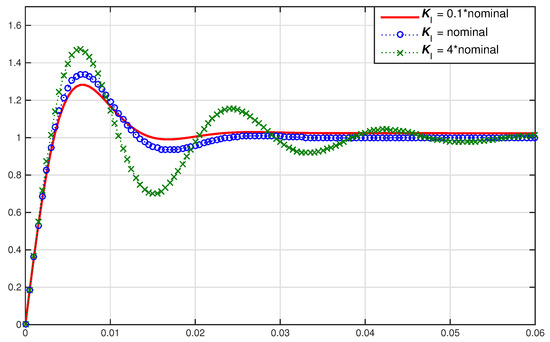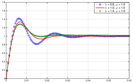 As can be seen in both Figure 6 and Figure 7, the steady state error is not exactly zero. Therefore, an integrator is added. Figure 8 shows the unit step responses with different values of for the integer order PID control with a nominal value of as mentioned above. It can be seen that the steady state errors are eliminated. Also, the responses that converge faster will have higher overshoots. Moreover, Figure 9 shows the unit step responses for different values of λ in the fractional order PID controller with nominal values of and . When λ is changed to 1.4, the overshoot is smaller than the integer order case and the settling time is approximately the same. This shows that varying fractional order derivative can further improve the transient response performances.