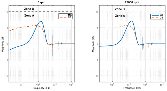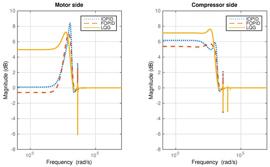 The second test is the sensitivity function frequency response measurement. Again, the three controllers used in the rotor vibration experiment are tested. For this testing, the perturbation signal of 100 mv with frequencies ranging from 0.1 Hz to 1200 Hz is added at the controller input and the sensitivity function frequency response is obtained from the relationship between the sum of perturbation and controller input signals and the perturbation signal itself. The frequency response plots for the cases of all three controllers for both the motor side and the compressor side are shown in Figure 25 and Figure 26, respectively. From these results, the sensitivity function peak under the FOPID controller is the smallest and falls into Zone A specification of the ISO standard [48], while the IOPID controller results in the largest sensitivity function peak and its magnitude falls into Zone B specification. Lastly, the trend of the sensitivity function frequency responses match the theoretical prediction in Figure 22.