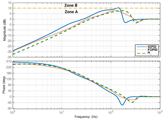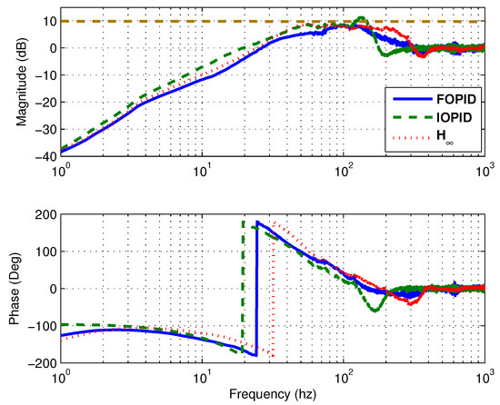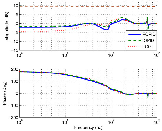 In Table 9, both the FOPID and the controllers achieve a stability margin to satisfy the Zone A requirement. On the other hand, the stability margin falls into Zone B when using a PID controller as shown in Figure 30. Moreover, the sensitivity function peak under the FOPID controller is close to the value achieved by the controller. The advantage of the FOPID controller over the controller is that the dimension of the controller is reduced by 50 percent. Lastly, all controllers have a bandwidth within the limit for the digital implementation of 5 kHz sampling frequency.