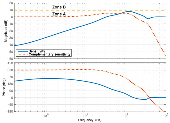 Bode plots of the thrust AMB sensitivity and complementary sensitivity functions.