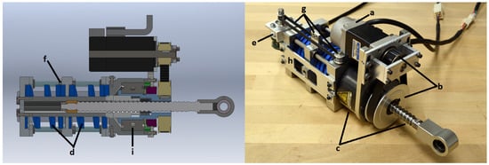 All other off-the-shelf components such as bearings and timing belts are selected by considering the targeted service life of the actuator and its cost-effectiveness. The custom parts are designed to minimize the machining time of the aluminum plates and ease the assembly of parts. In order to make the assembly process easier and to add torsional stiffness to the actuator body, side plates are added to the design (h in Figure 1).