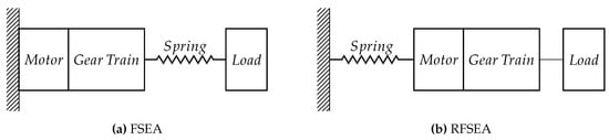 There are two fundamental SEA structures. These are referred to as Force Sensing Series Elastic Actuator (FSEA) and Reaction Force Sensing Series Elastic Actuator (RFSEA) []. Figure 2 shows the simplified models of FSEA and RFSEA. The re-engineered SEA in this study has the RFSEA structure. Compared to prismatic FSEAs, RFSEAs are more compact and have a larger range of motion. In RFSEA designs, the spring is located between the motor and the ground. Therefore, the load is directly connected to the gear train. While this reduces the impact tolerance, compensation is provided by the high impact tolerance of the ball-screw mechanism. Another drawback of RFSEA is the larger sprung mass which includes the mass of the motor, inertia of the rotor and the gear train. This results in a more complex force calculation for the RFSEAs. For FSEAs, the output force can be calculated directly from spring deflection whereas for RFSEAs, the force seen at the output is the sum of the inertial force of the sprung mass of the actuator, the force due to the effective friction in the system, and the spring force. Figure 3 shows the general model of the SA-SEA which shows the system components affecting output force.