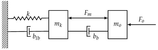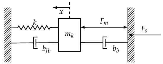 Model of the SA-SEA. Here, k is the effective spring stiffness, is viscous friction at the linear ball bearings supporting the spring cage, is the total sprung mass of the actuator, is the motor force, is the viscous back-drive friction of the ball-screw mechanism, is the output mass and is the output force.