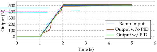 For force input tracking, the actuator output was rigidly grounded as modeled in Figure 6 and a PID based force controller, which is shown in Figure 7, was used. In order to see the system’s response for rapid changes in desired force, we applied an exponential chirp signal with an amplitude of 100 and a frequency range of 0.1–100 Hz for a 30 duration. This experiment is necessary in order to see the system’s frequency response at high frequencies and to see the force bandwidth of the system.