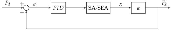 Since we designed the SA-SEA for industrial and educational applications, we only used a PID controller. PID control is a simple and effective control approach used for more than 90% of the industrial control applications. It is also one of the most fundamental control method taught in control education. PID control can be realized by using a PLC which is a common controller selection in industry. Figure 7 shows the force controller used in this study. As it can be seen on the controller diagram, there is no filter applied to the feedback signal. Low noise level on the feedback was achieved by taking advantage of the high noise immunity of the RS-485 communication and the high data update rate of the encoder. This enables multiple sensor readings to be done in one control cycle, eliminating any inconsistent feedback data. The only filter used in this controller is the first order low-pass derivative filter given in []. In this control approach, the required motor torque command is calculated from the desired spring force by using the system parameters and is sent to the motor driver.