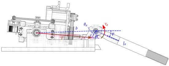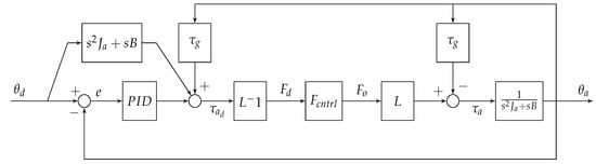 The second controller designed for the SA-SEA is a joint position controller. In joint position control, the goal is to accurately follow the rapidly changing desired joint positions. After achieving an accurate force control performance, we used the designed force controller as a building block for the position controller. The force created at the actuator output is converted to joint torque using the mechanism shown in Figure 8. The joint torque () which is created with the force output of the actuator (F) can be calculated as follows []: