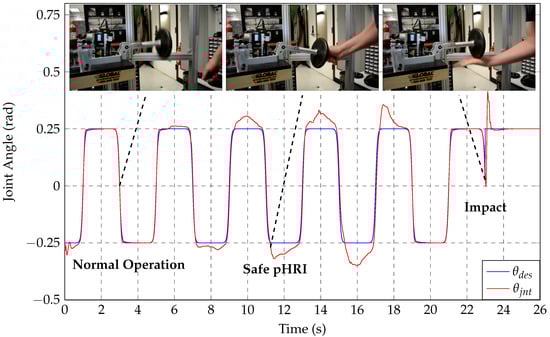 Physical human-robot interaction (pHRI) and impact recognition. The experiment starts with position control. The user interacts with the actuator safely and then causes impact at around s. The actuator quickly moves to safe position in the reverse direction.