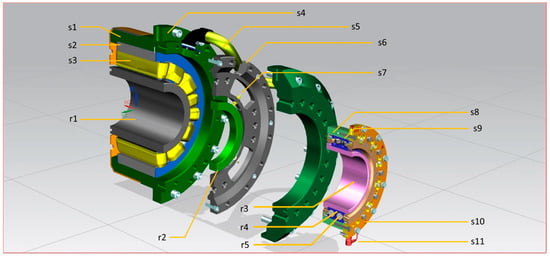 Figure 1. Components of magnetic bearing rotors and stators (possible configuration). r1: laminated rotor core, r2: sensor target ring, r3: back-up bearing sleeve, r4: back-up bearing inner ring(s), r5: back-up bearing balls; s1: magnetic bearing housing, s2: laminated stator core, s3: stator winding, s4: bearing flange, s5: cable routing, s6: sensor fixation assembly, s7: displacement sensor, s8: back-up bearing housing, s9: back-up bearing outer rings, s10: back-up bearing flange, s11: back-up bearing condition monitoring sensor (acceleration sensor).