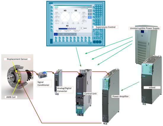 Figure 2. Electronics and power electronics of a magnetic bearing. The major components are: displacement sensors, signal conditioners, analog/digital converters, control units, supervisory control system, power amplifiers, and an infeed. The infeed provides the DC link for the power amplifiers. Furthermore, a standard 400 V industrial uninterruptible power supply (UPS) is used to ensure uninterrupted operation in case of short term power failures.