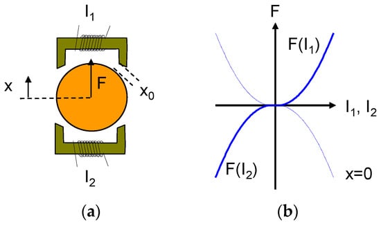 Figure 3. Setup requiring a non-linear control strategy: I1 > 0, I2 = 0 for F > 0 and I1 = 0, I2 < 0 for F < 0. (a) Coil arrangement without bias current; (b) Non-linear current-force relationship.
