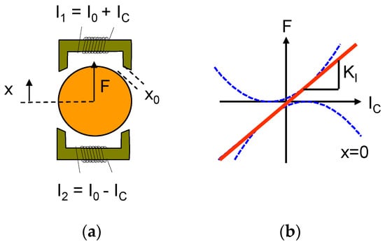 Figure 4. Conventional control strategy for AMB coils: constant bias current I0 and control current IC. (a) Coil arrangement with bias current; (b) Linear current-force relationship.