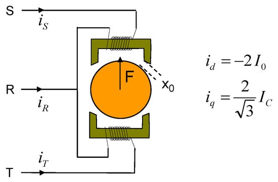 These equations show that flux current id influences the current in phases S and T in the same way, and torque current iq increases the current in phase S, while it decreases the current in phase T. If the magnetic bearing coils are connected to the inverter as shown in Figure 5, current iS flows through the upper coil and current iT flows through the lower coil. If id is chosen to be id = −2·I0 and iq is chosen to be iq = 2/sqrt(3)·IC, then the complete bearing axis can be operated using just one servo inverter, while the drive software modification is mainly restricted to keeping the rotor angle in the Clarke–Park transformation at a fixed value.
