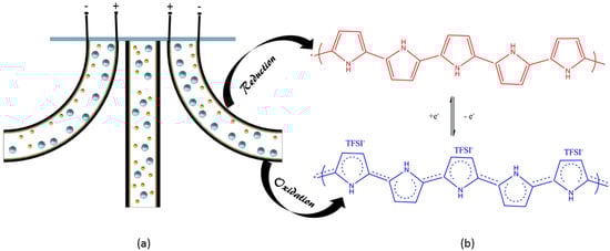 - Lu, W.; Fadeev, A.G.; Qi, A.; Smela, E.; Mattes, B.R.; Ding, J.; Spinks, G.M.; Mazurkiewicz, J.; Zhou, D.; Wallace, G.G.; et al. Use of ionic liquids for π-conjugated polymer electrochemical devices. Science 2002, 297, 983–987. [Google Scholar] [CrossRef] [PubMed]