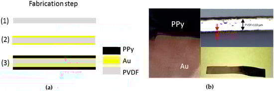 Illustration of the process steps for the tri-layer actuator; fabrication steps and images after polymerization. (a) (1) A 5 cm × 5 cm piece of commercial PVDF membrane is cut from the roll; (2) Sputter deposition of 5 nm Au on both sides of the PVDF; (3) Electrochemical synthesis of PPy on gold electrode. (b) The final actuator with the dimensions of 5 cm × 5 cm, optical image of cross section and cut out from the membrane.