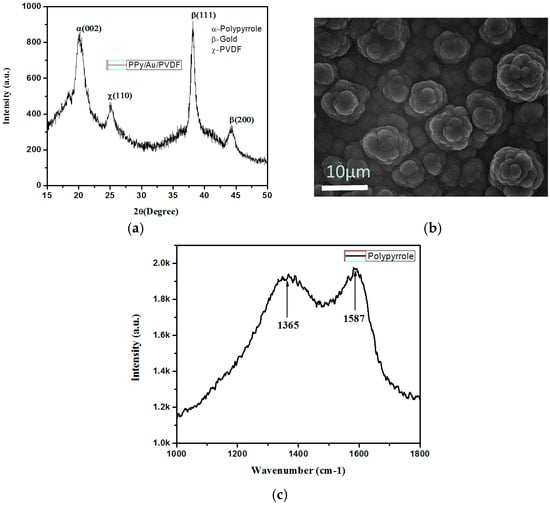 As shown in Figure 3a, X-ray diffraction studies show that the PPy film is crystalline in nature, with a sharp diffraction peak observed at about 2θ = 23°. The sharp peak is characteristic of crystalline PPy [], and is due to the scattering from PPy chains at the interplanar spacing [,]. Figure 3c illustrates the Raman spectrum of PPy/Au/PVDF, the characteristic bands of which appear at 1587 and 1365 cm−1, which were assigned to the C-C backbone stretching and the ring stretching vibration of PPy, respectively [].