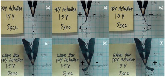 Images of different frame grabs showing actuation of a PPy tri-layer actuator in open air and the glove box. (a–c) show the actuation at ±1.5 V in open air, while (d–f) show the actuation inside the glove box, i.e., inert environment.