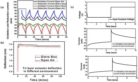 (a) Oxidation and reduction currents of the PPy tri-layer actuator in the glove box and open air at ±1.5 V with the same dimensions; (b) Displacement of the polypyrrole actuator contacted by the Kelvin clip in the glove box and open air; (c) Step input voltage and output current in the inert and open environments.