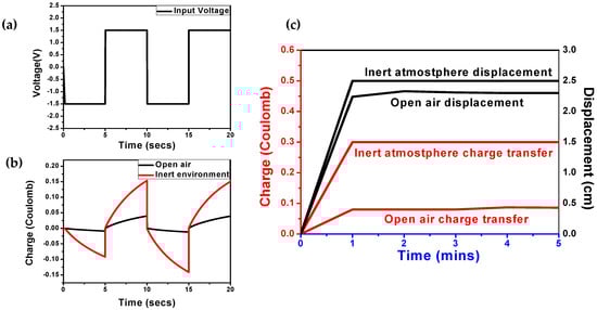 (a) Input voltage of ±1.5 V square wave; (b) Charge transfer in as inert environment and open air; (c) Displacement vs. charge plot with respective time of the polypyrrole actuator contacted by Kelvin clip in the glove box and in open air.