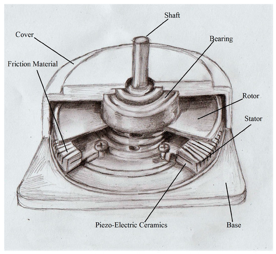 Ultrasonic motors are a class of rotary type piezoelectric actuators known as harmonic motors. They operate at a high voltage (approximately 200–300 V). Since the operating frequency of this motor is located in the ultrasonic range (25 to 70 KHz), this type of motor is referred to as an “ultrasonic motor”. The type of motor considered in this research is the ring-type piezoelectric travelling wave rotary ultrasonic motor. Two sinusoidal signals with a 90° phase difference drive the motors at a speed adjusted by the amplitude of these signals [17]. These waves resonate and propagate a wave into the stator. The propagation of the rotary wave into the ceramics of the stator is converted into the mechanical motion of the rotor by a friction mechanism. The rotational direction depends on the lead or lag of the input signals. In an ideal case, the generated power would be equal for both rotational directions; i.e., clockwise (CW) and counter clockwise (CCW).