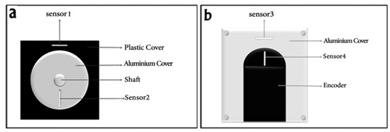 Four fiber optic temperature sensors (Neoptix Inc., Mississauga, ON, Canada) were attached to measure its temperature while operating at 75% of its maximum speed. Sensor 1 was on the plastic cover of the motor case at the front, Sensor 2 was on the aluminum cover of the motor case at the front, Sensor 3 was on the aluminum cover of the motor case at the back, and Sensor 4 was on the encoder case attached at the back of the motor. Sensor placement is shown in Figure 3.