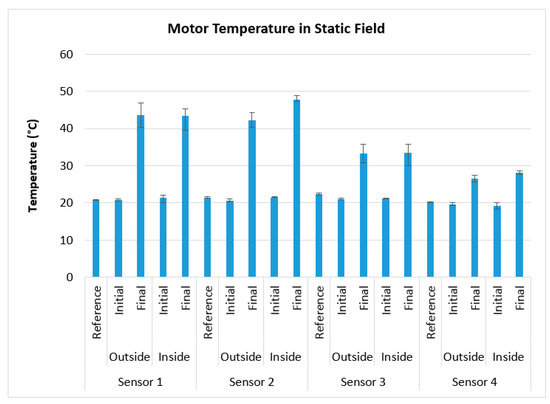 The driving conditions were as follows: the driving voltage was 120 V, the driving frequency was in the range of 34 to 37 KHz, and the energy supply was an AC voltage source. The initial value of the recorded temperature and the final value after 20 min are plotted in Figure 5. In this figure, the reference temperature refers to the room temperature recorded for each sensor. The outside temperatures refer to the signals recorded outside the five-Gauss line when the motor was on. The inside temperatures refer to the signals collected with the motor located inside the bore. The error bars show the minimum and maximum recorded temperatures. A temperature increase of 13% was observed on Sensor 2. A comparison of the outside and inside final temperatures showed that the temperature increase for the other sensors was trivial.