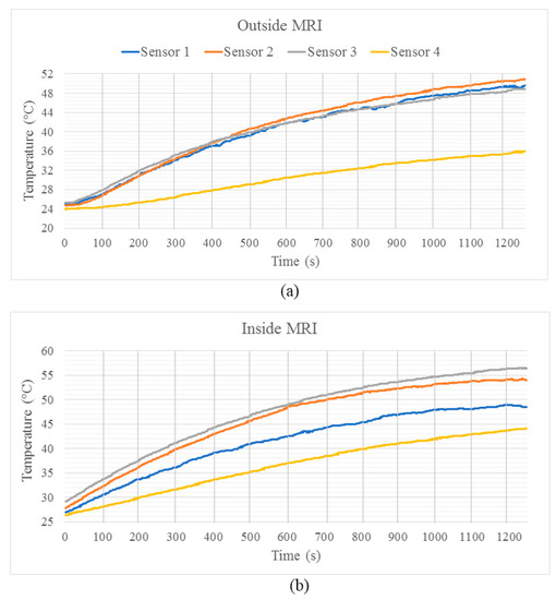 Figure 6 shows the USM temperature increase while the motor and scanner were on for 20 min. Figure 6a illustrates the temperature when the motor in the on state was placed outside the five-Gauss line. Figure 6b shows the data when the motor was placed inside the scanner and the four common clinical sequences were employed. The temperature increased by approximately 10 °C while the motor was operating in the MRI system, reaching 60 °C while common clinical imaging sequences were being applied in the MRI system.