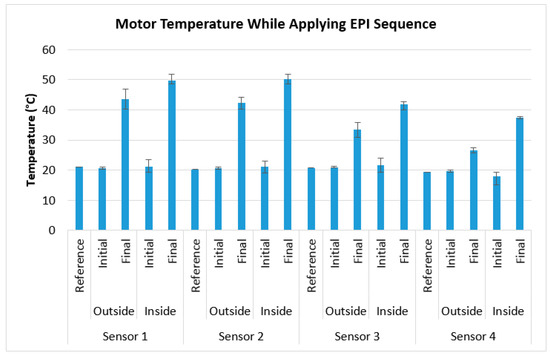 Figure 7 illustrates the temperature of the operating motor inside the bore while applying EPI sequences. In this case, the reference refers to the room temperature recorded for each sensor. The outside temperatures refer to the signals recorded outside the five-Gauss line when the motor was on. The inside temperatures refer to the signals collected with the motor located inside the bore. The error bars show the minimum and maximum recorded temperatures. Temperature increases of 14.2%, 18.8%, 25.6%, and 40.4% were observed for Sensor 1, Sensor 2, Sensor 3, and Sensor 4, respectively.