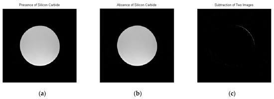 (a) The T2-weighted turbo spin echo (T2W) transverse image of the phantom in the presence of silicon carbide sheet; (b) the same image in the absence of the sheet; (c) the subtraction of these two images (a,b).