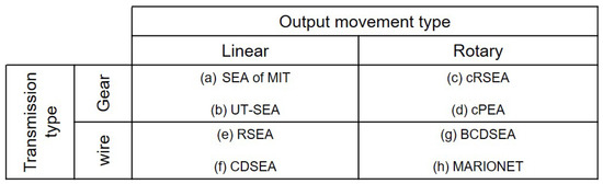 The SEAs which are categorized in terms of the types of transmission and the types of motion. (a) Series Elastic Actuator [2], (b) University of Texas-Series Elastic Actuator [13], (c) compact Rotary Series Elastic Actuator [14], (d) compact Planetary-geared Elastic Actuator [15], (e) Rotary Series Elastic Actuator [16], (f) Cable Driven Series Elastic Actuator [17], (g) Bowden Cable Driven Series Elastic Actuator [18] and (h) Series elastic actuator of MARIONET [19].