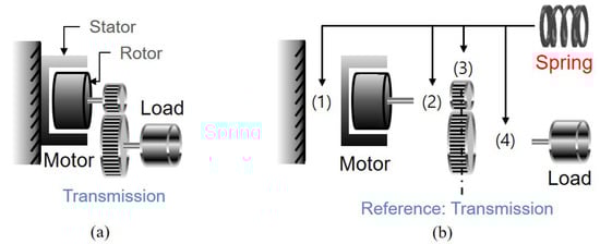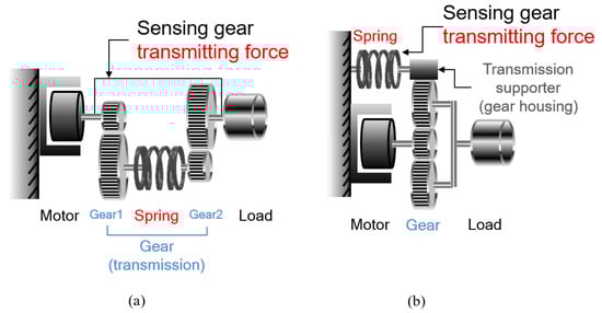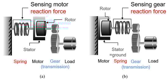 Both cases can be considered as RFSEA because the reaction force that occurs before transmission can be measured during driving. The dynamic characteristics, however, of two types are different: the inertia of the motor stator should be taken into account in Figure 6a, since it is not fixed as in Figure 6b and generates inertial force/torque.