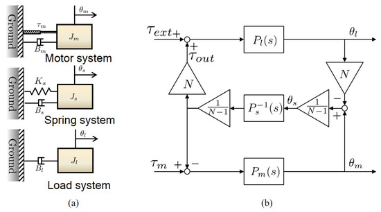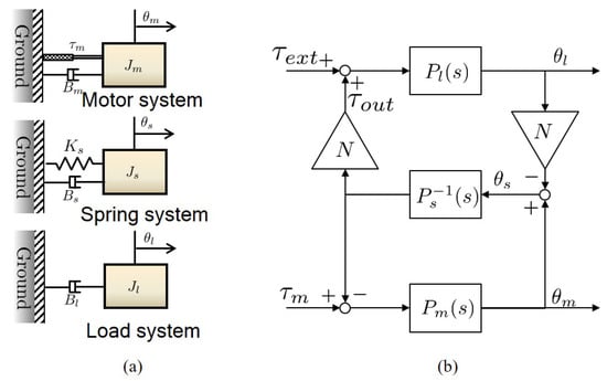 SEA is basically a flexible system consisting of two masses, and [23] has thoroughly investigated the dynamics of SEA using the two-mass dynamic model. The two-mass dynamic model can be interpreted as the combination of three kinds of free-body dynamics as illustrated in Figure 10a. The free-body dynamics of FSEA consists of: