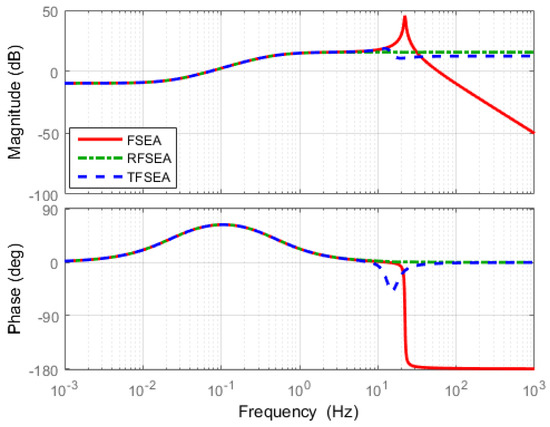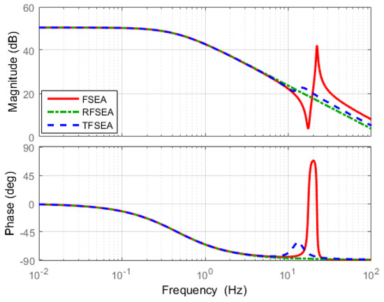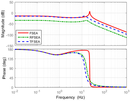 The most significant difference among the three FRFs is the magnitude level in the high frequency range. Magnitudes of RFSEA and TFSEA are maintained constantly even in the high frequency range, while the magnitude of FSEA decreases in the high frequency range, which represents the high frequency motor torque cannot be delivered to the load in FSEA. Since Transmissibility is related to the torque transmission efficiency of SEA, it can be said that RFSEA and TFSEA are superior to FSEA in terms of efficiency. The comparison of the numerators of Equations (25)–(27) reveals that the high transmissibility of RFSEA and TFSEA is attributed to the inertial part in the spring system. This is an interesting point which suggests that the different mechanical configuration of SEA can improve the torque transmission efficiency. This point also verifies that the proposed assessment criteria can reveal dynamic characteristics that could not be revealed previously.