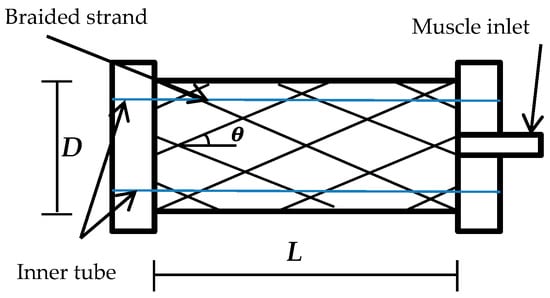 Where L is the length of the actuator, D is the diameter, and θ denotes the braided angle, which it is measured between braided strand (b) and the vertical line, its value varies from 0° to 180° based on the construction and is the main aspect in the PMA’s actions. The initial values are defined as L0, D0, and θ0, respectively.