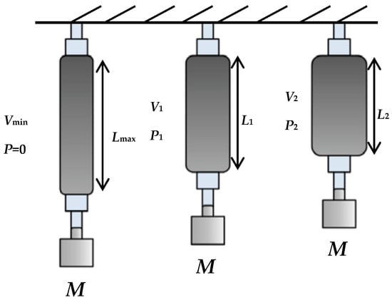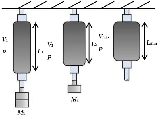 The second action situation is pressurising the PMA at constant air pressure P. Varying the attached load, as shown in Figure 4, leads to changes in the behaviour of the PMA. Reducing the load from M1 to M2, and then to no load, will raise the volume and reduce the length of the actuator []. The multiple lengths and volumes produced depend on the amount of the air pressure inside the muscle.