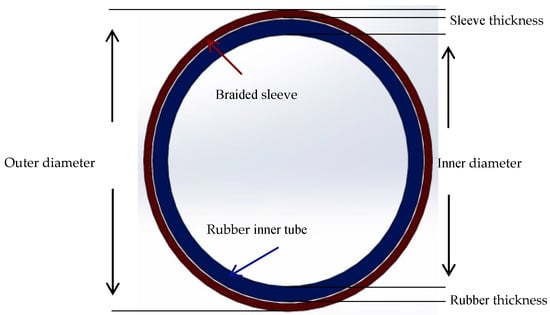 where V is the volume in m3, Din is the inner diameter in m, L is the length of the PMA in m, Dout is the outer diameter in m, and ThD is twice the value of both the inner rubber tube and the braided sleeve thickness. Figure 5 shows the cross-section of the actuator structure.