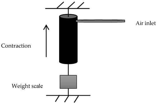 In Figure 2, n represent the total amount of strand turns for the whole actuator. n is a constant value for each actuator and it depends on the length and specification of the braided sleeve. The other coefficients, such as L, D, and θ, are varied due to the amount of air pressure and the construction of the air muscle. In the first operation, as is shown in Figure 3, the actuator is fixed at the upper end and a specific load is attached to its free end. The air pressure slowly increases from zero bar to a certain value. Due to the similarity between the pneumatic muscle and the biological muscle, the contraction in the first operation is called isotonic, and measuring the contraction at the second operation is called isobaric [].