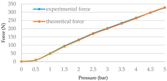 The actuator is pressurised from zero to 5 bar by 0.5 bar steps; at each step, the length of the PMA is recorded. From Equation (10), the resistance force of the inner rubber tube is illustrated in Figure 7, as a function of the input pressure.