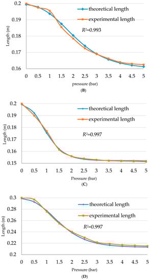 The length of the contraction PMA decreases, while the applied pressure is raised. However, the contraction ratio (ε) is not fixed for all actuators and it depends on the type of inner rubber tube, the diameter of the PMA, and the maximum diameter of the braided sleeve. Al-Ibadi, et al. [] proposed a length formula as in Equation (14).