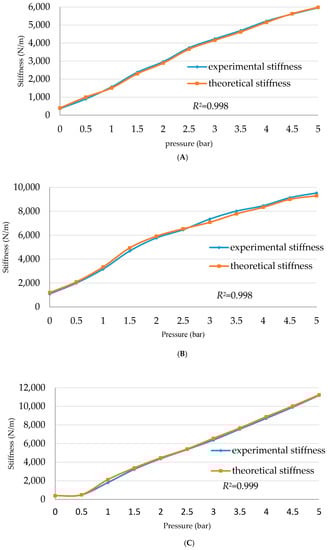 The experimental and theoretical stiffness of the three different PMAs. (A–C) represent the stiffness for the PMAs in Table 5 respectively.