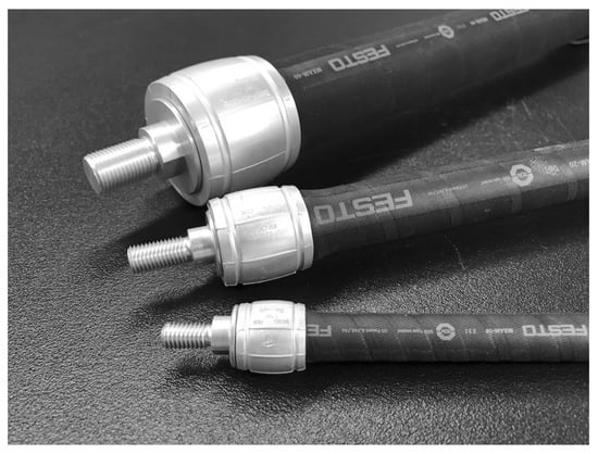 In recent years, pneumatic muscle actuators (PMAs, Figure 1) were integrated in many robotic systems [,,,] and are still particularly favored, especially in applications that have to be lightweight and powerful.
