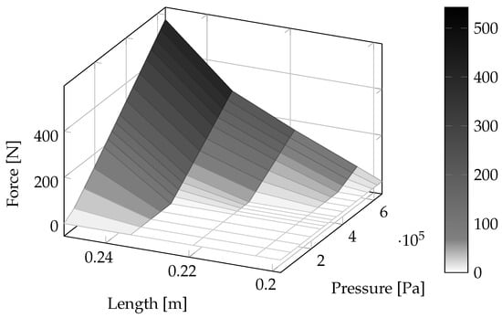 During the measurement, all screws are fastened and the PMA length is fixed. The pressure is varied between the length-dependent lower limit and the maximum pressure. While varying the pressure, the PMA force is measured by a 1D-forcesensor KD9363-0.5t and a GSV-1A measurement amplifier, both from ME-Meßsysteme GmbH (Hennigsdorf, Germany). Combining the pressure-dependent force characteristics for different lengths, it is easy to determine the static force characteristic as shown in Figure 2. To reduce the influence of measurement errors, the measurement process has been repeated ten times. The depicted force map therefore shows the mean values. Both measured force maps, for the Festo DMSP-10-250 and the DMSP-20-300, can be found in the appendix in Table A1 and Table A2, respectively.